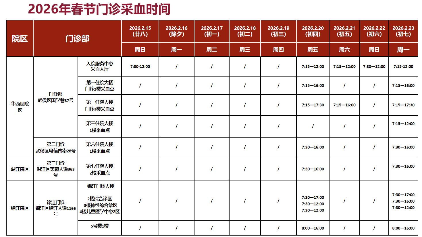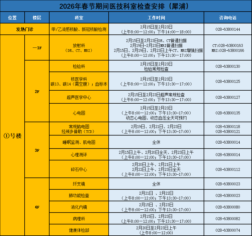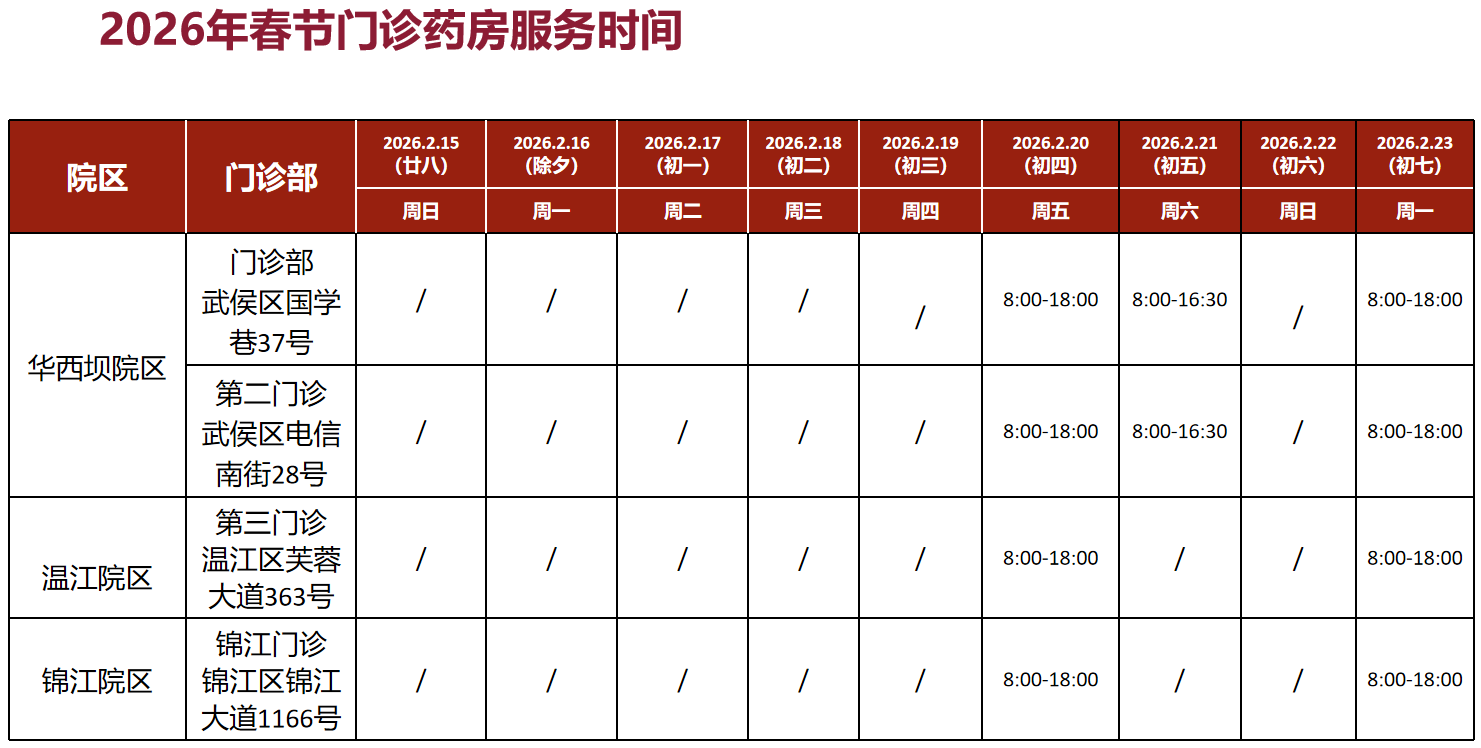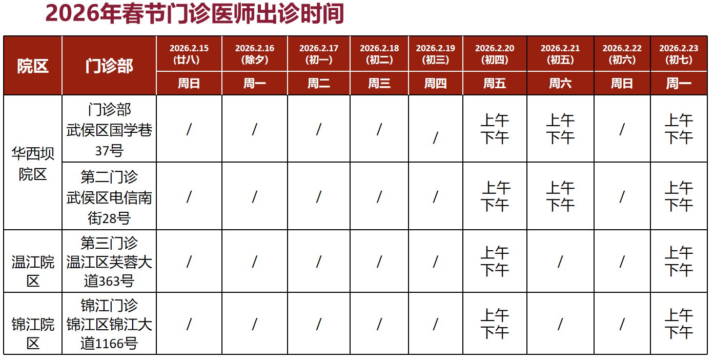 2月15日不开诊,2月16日-2月19日门诊含采血及搜检科室(包括华西坝院区、温江院区、锦江院区)停诊4天,急诊(华西坝院区、锦江院区)照常入手。
