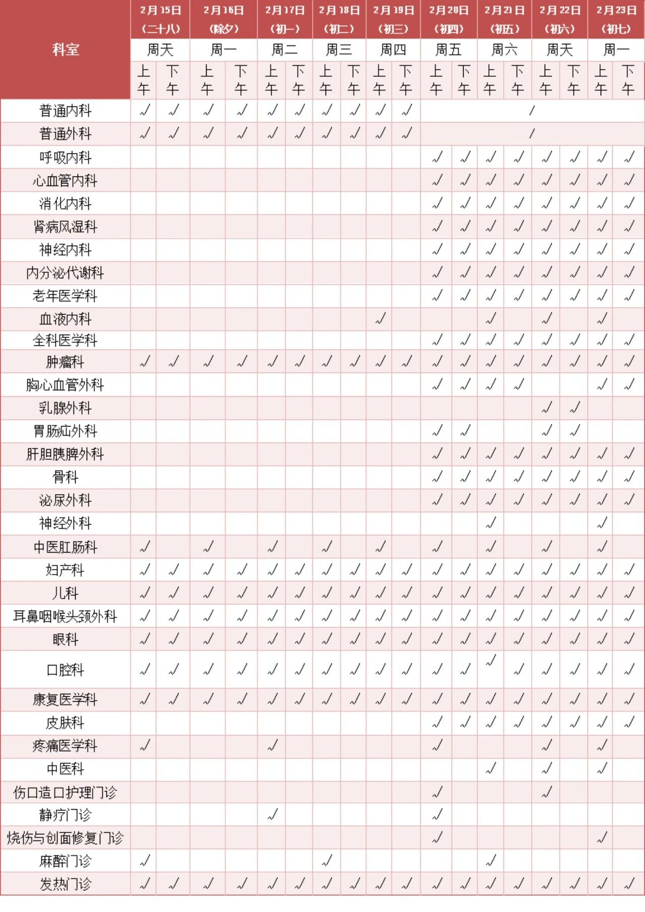注:“√”代表开诊,“空缺”代表不开诊