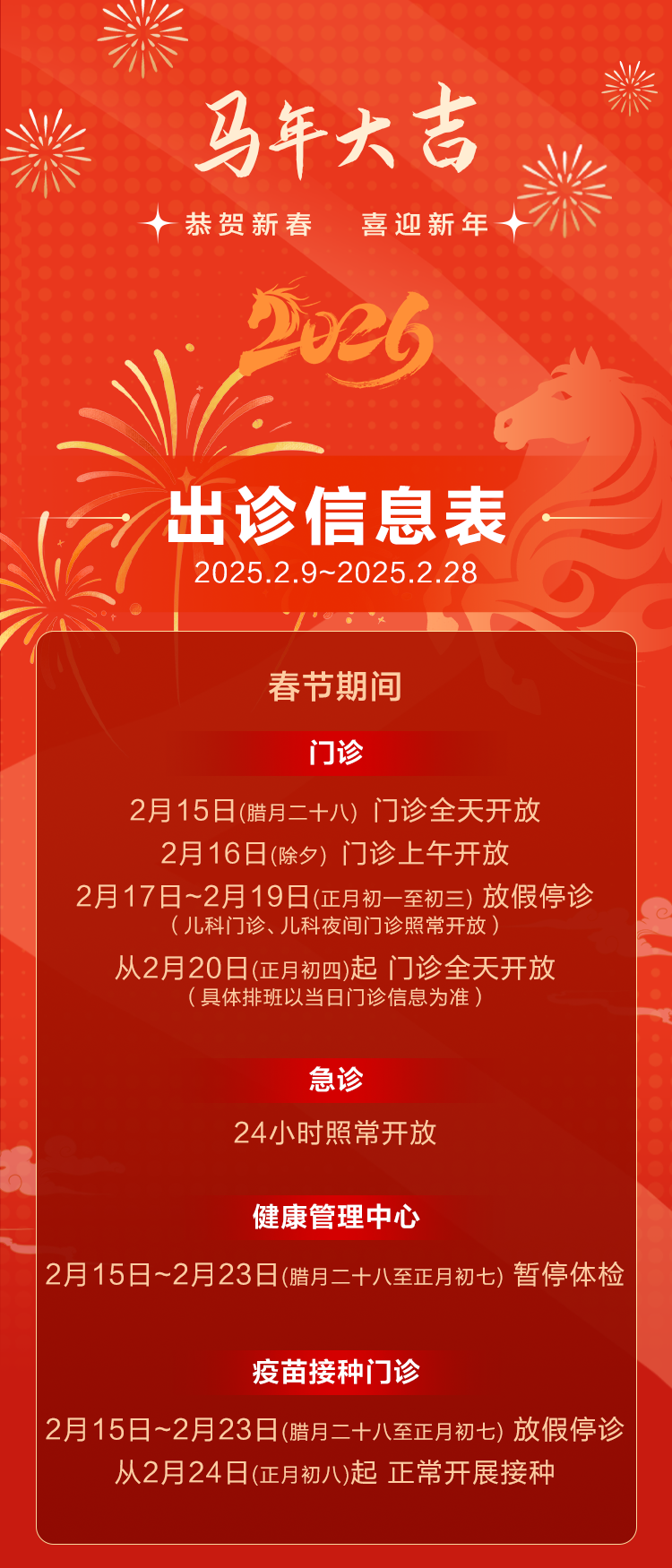 2026年春节(2月15日-2月17日)门诊暂停通达,急诊24小时入手,2月18日(大岁首二)门诊各专业复原出诊。