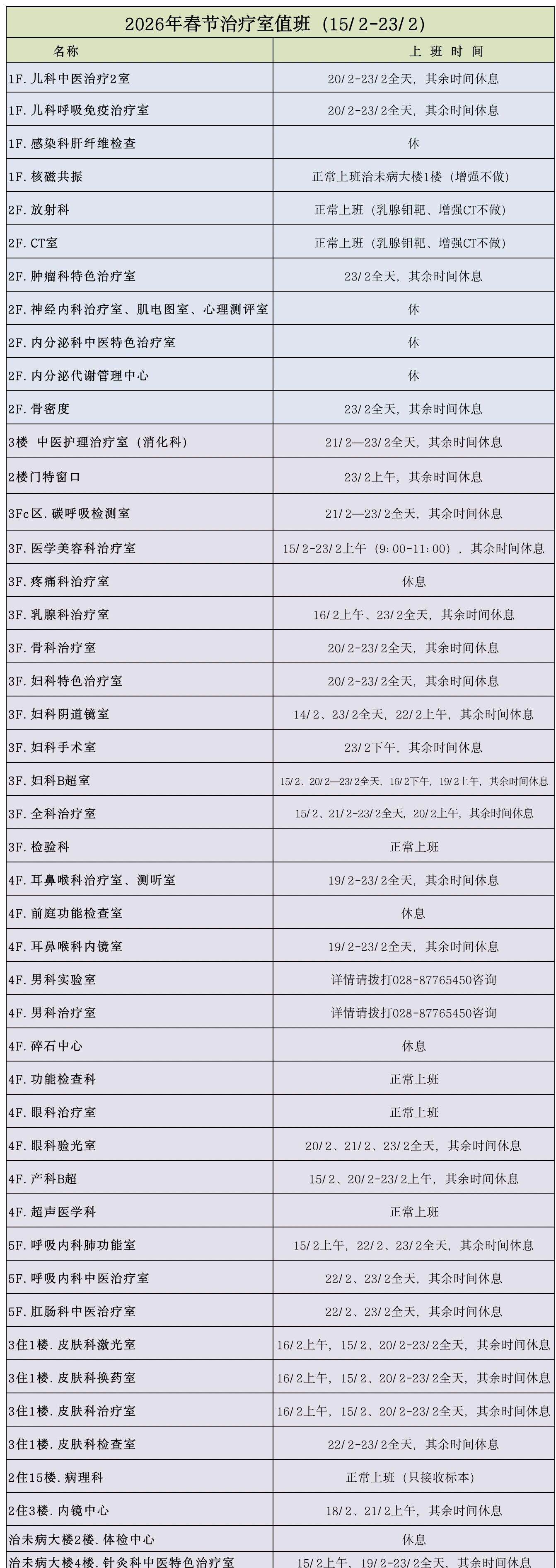 2.第三门诊部(高新门诊)、第五门诊部2月16日—2月18日(除夕至大岁首二)休息;2月15日、2月19日—2月23日(大岁首三至大岁首七)内科开诊。