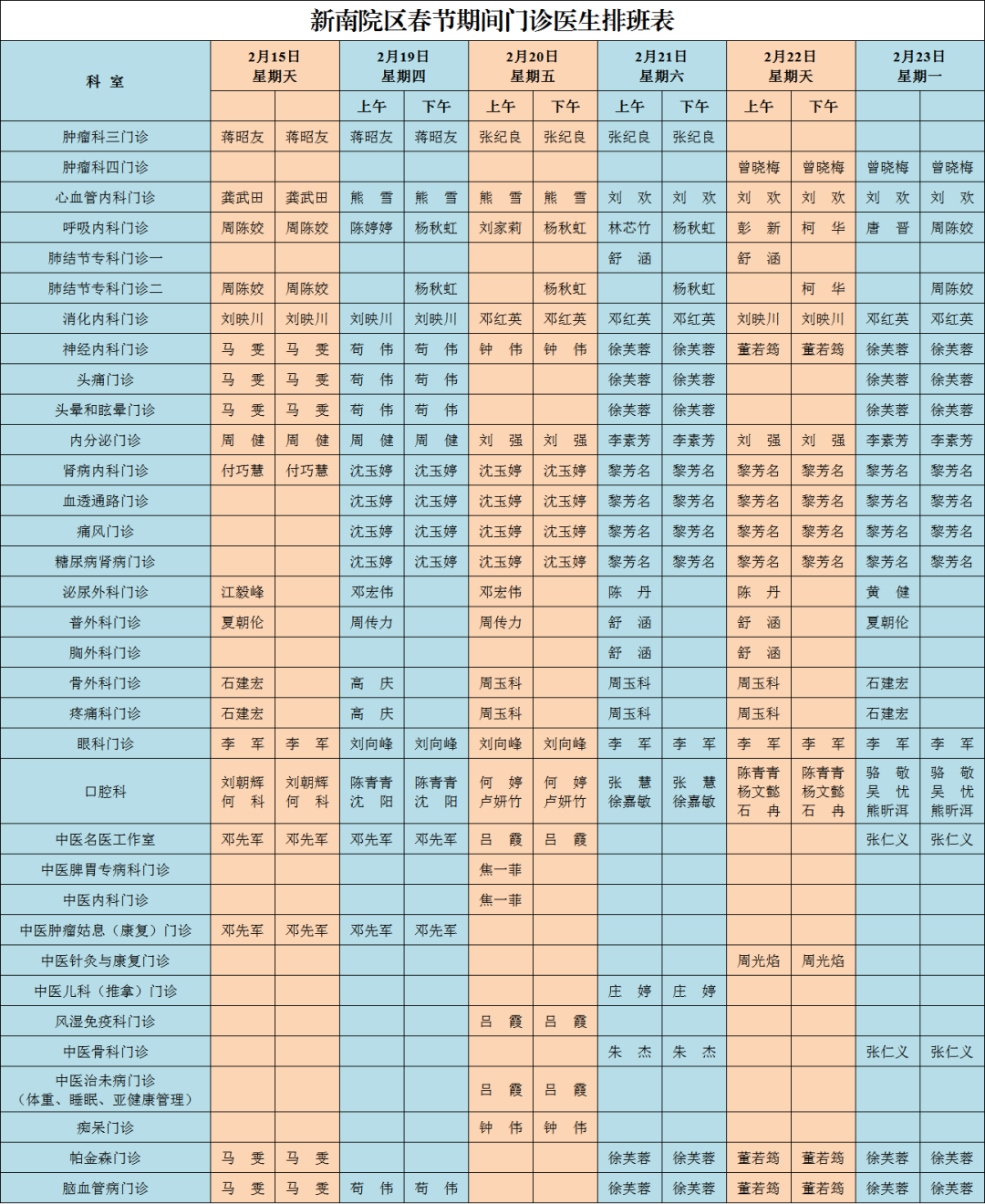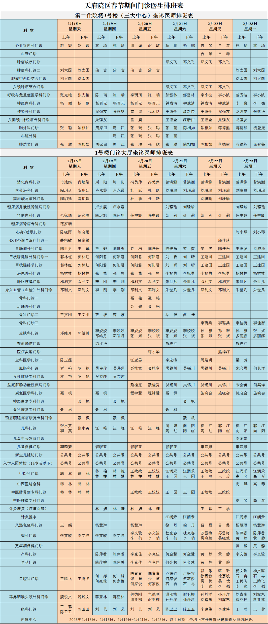 2月15日,2月19日—2月23日表里科及部门专业门诊复原辽远眺诊;