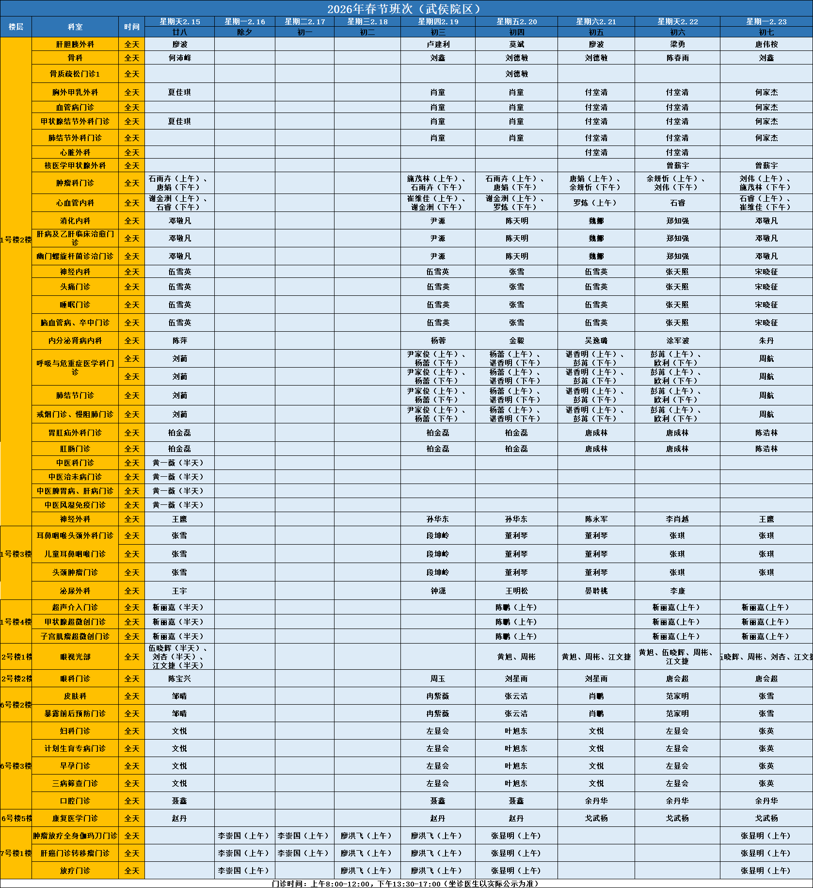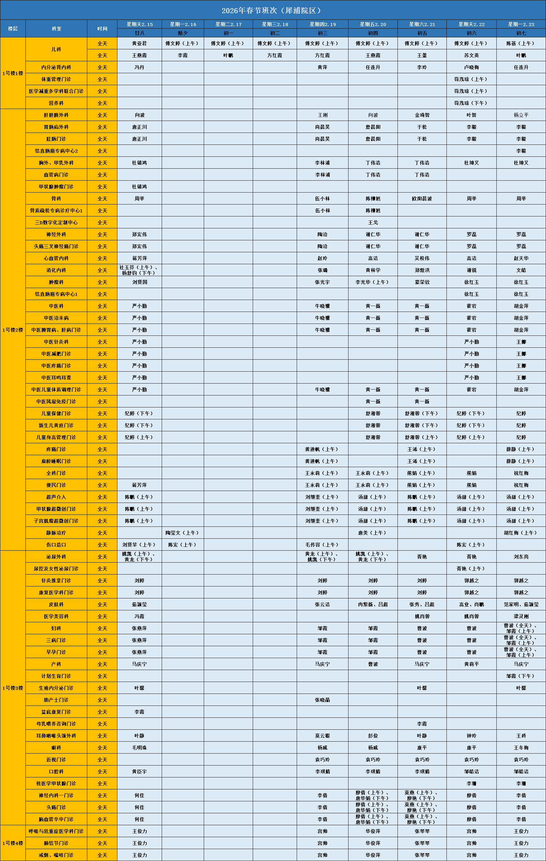肿瘤科:2月18日-2月23日上昼半天。