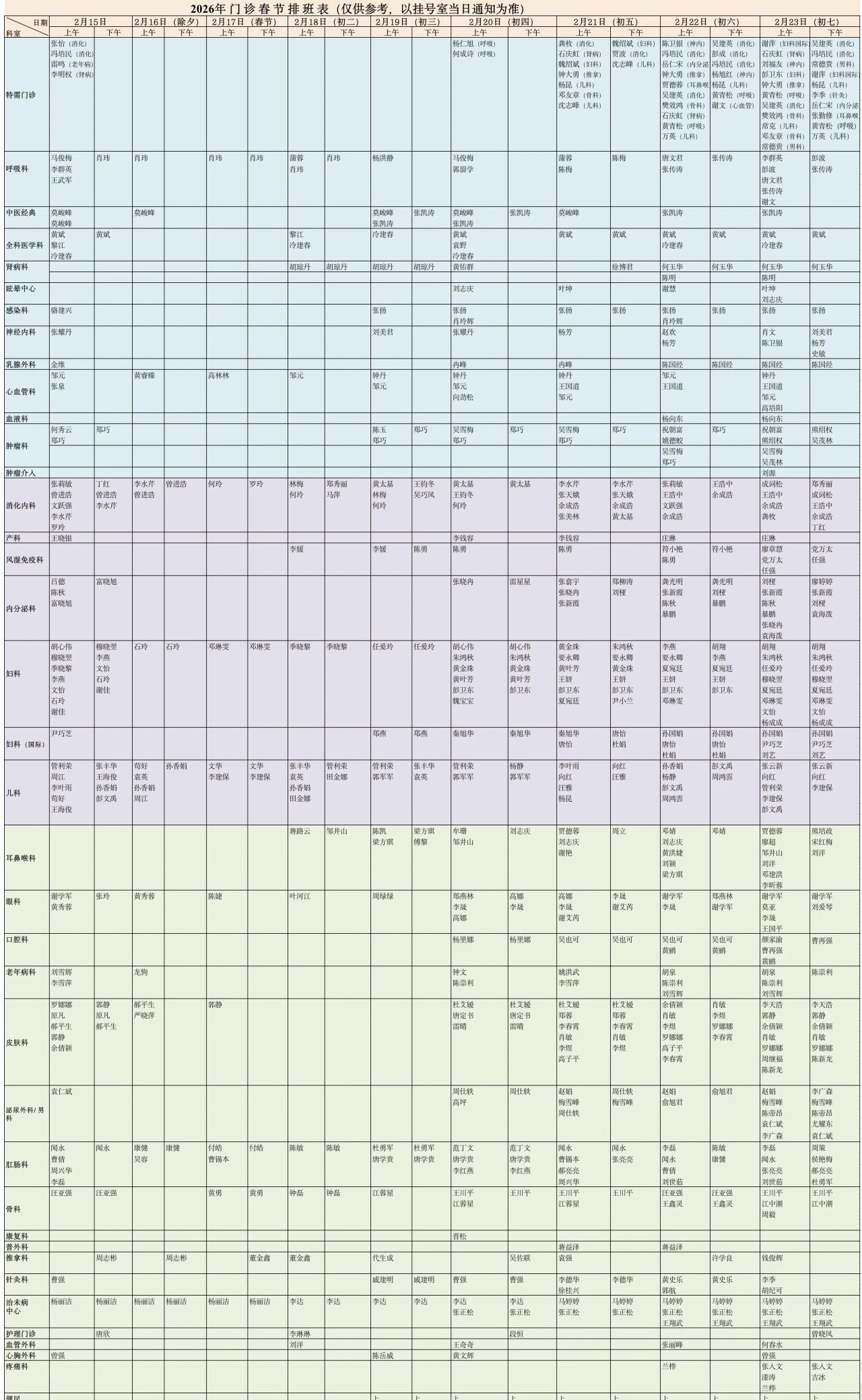 春节假期(2月15日-2月23日),三六三病院门诊出诊安排如下: