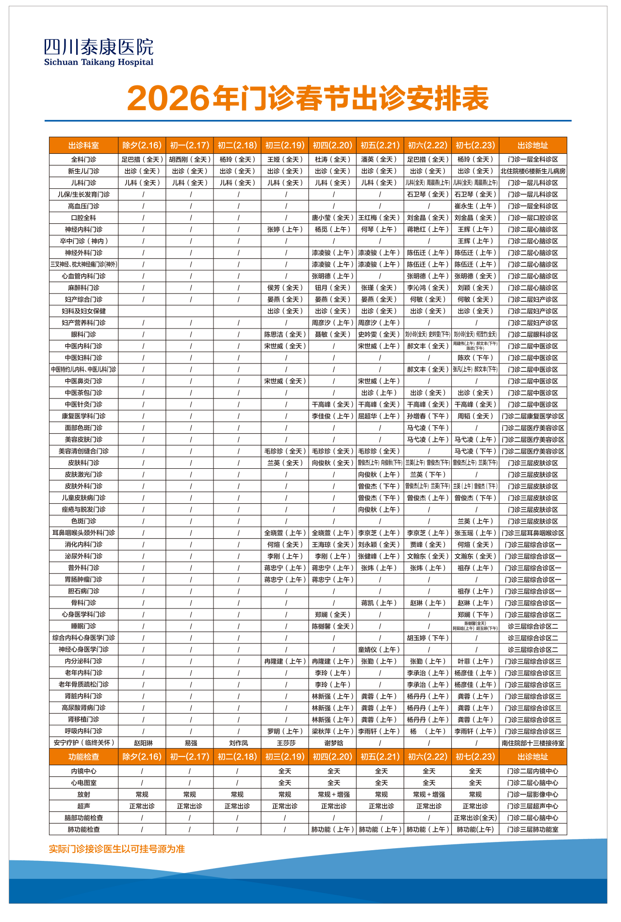 请以当日现场排班为准,细则请关爱“成医附二院·核工业四一六病院”微信公众号,实时查询医师排班信息。